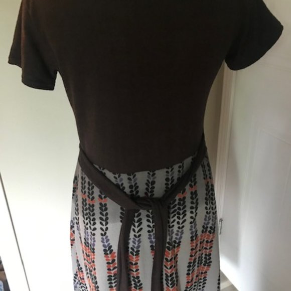 Jolie robe légère et agréable à portée. Le haut est marron. Possède une ceinture qui peut s'attacher devant ou derrière. La robe arrive juste en bas du genou. Je ne l'ai portée qu'une seule fois. Parfaite pour la saison qui arrive.