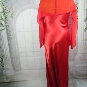 Robe de satin rouge avec châle. Jolie breloque au centre du buste.