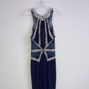 Robe de bal bleu marine dos ouvert, avec paillettes et perle.
