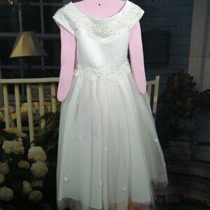 Robe blanche de bouquetière ou de première communion en satin et tulle avec petite broderie, paillette et perles.