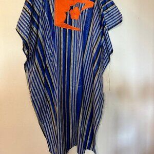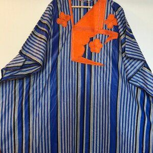 La robe présente un motif vibrant avec des rayures bleues dominantes, rehaussées par des accents orange vif. Les détails orange, notamment les fleurs, ajoutent une touche unique et colorée.