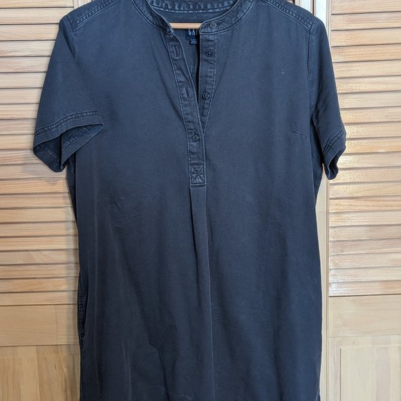 Denuim doux. Col en V. Manches courtes. Devant boutonné. Deux poches latérales. Coupe droite.