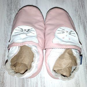Leather with a suede sole, Sizing is roomy to accommodate different feet sizes and allow for growing feet. Good condition, normal wear, lots of time left with these cuties :)