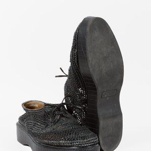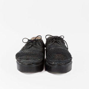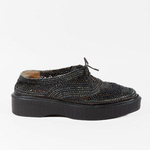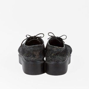 A unique pair of black Oxford shoes from Robert Clergerie, featuring a lightweight woven raffia upper, nude leather insoles, an almond toe, lace-up closures with leather laces, and black rubber platform soles.