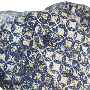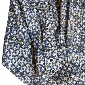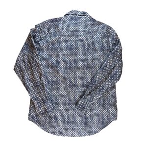 Stylish dress shirt with intricate pattern. Features a blend of blue and white. Perfect for formal occasions. Length 31" Bust 46" Sleeves 25"