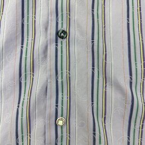 This Robert Graham button-up shirt features a vibrant purple color with bold striped accents. It’s in excellent condition and perfect for adding a pop of color to your wardrobe. If you have any questions or need more details, feel free to reach out!