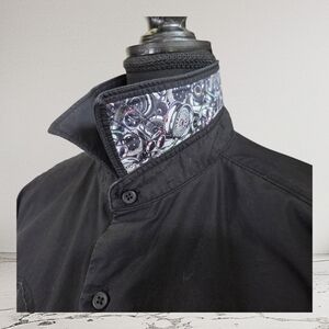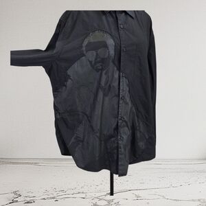 Stylish black dress shirt. Features unique graphic design. Perfect for formal occasions. Length 32" Bust 50" Sleeves 26"
