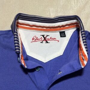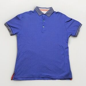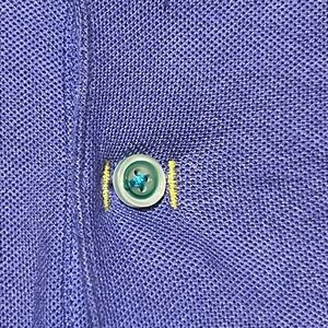 Stylish purple polo shirt with striped collar and arm cuffs. Features a bright orange piping on inside collar, yellow contrast stitching at button holes, green buttons and other fun colourful accents.