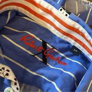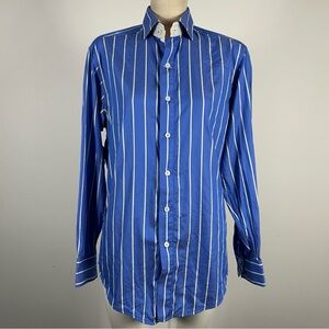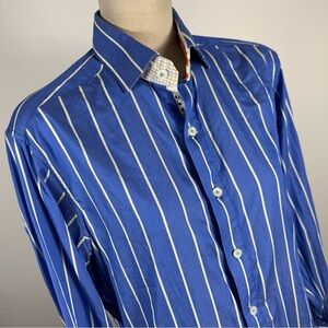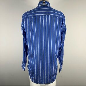 Elegant royal blue shirt with crisp white stripes. Perfect for any occasion. Features a classic collar and button-up style.