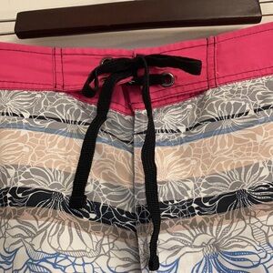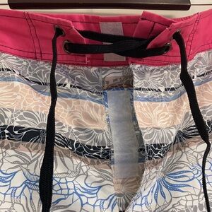 Classic swim trunk board short style, these vibrant printed shorts have a velcro and drawstring closure.