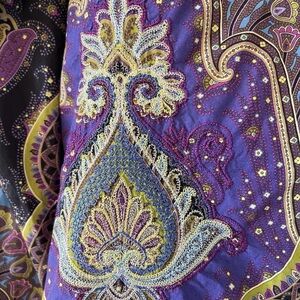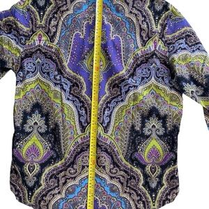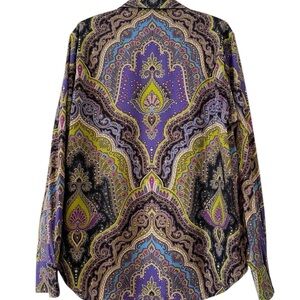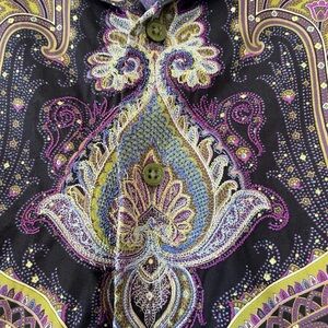 Stylish paisley shirt with intricate patterns. Features rich purple and green hues. Perfect for a bold look.
