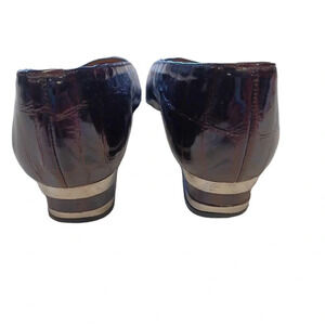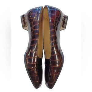 Alligator print, these pumps feature square toes and a low heel. Dark brown with a hint of oxblood in color.
