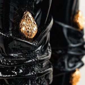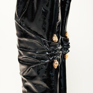 Roberto Cavalli's knee-high boots feature a pointed toe and stiletto heels, with front ruching, anchored by golden twin snake heads. These tall black patent leather boots wrap the calf with side zipper closures.