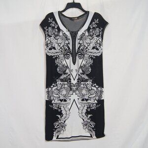 Absolutely gorgeous Roberto Cavalli bodycon dress featuring an intricate black and white floral baroque print. This figure-hugging piece showcases the brand's signature luxurious design with detailed botanical motifs that create a stunning visual impact. Cap sleeves and crew neckline offer a classic silhouette while the fitted cut flatters your curves.