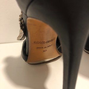 Authentic Roberto Cavalli Ayers metallic chain trims embellished ankle strap. Zip fastening along back. Open almond toe Leather sole. Crossover straps. Made in Italy. Heel height is 4″. Excellent condition with minor wear throughout. Comes with dust bag.