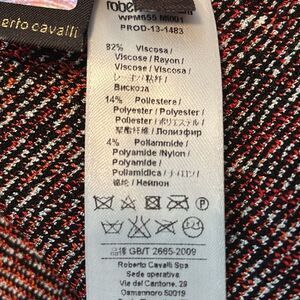 Elegant Roberto Cavalli dress with a striking black and red pattern. Features a V-neck and three-quarter sleeves.