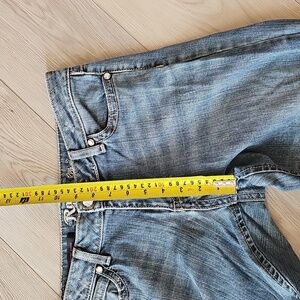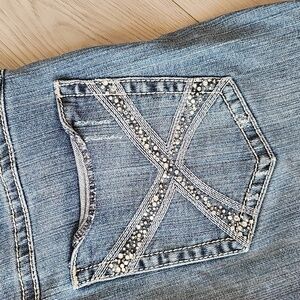 a Y2K meets Country moment. Rock 47 by Wrangler Low Rise Blue Jeans. has being buttons and a bedazzled pocket. I believe these are bootcut but im not 100% sure, be sure to compare measurements before purchase to ensure best fit! size 9/10 x 36 (i think they fit smaller)