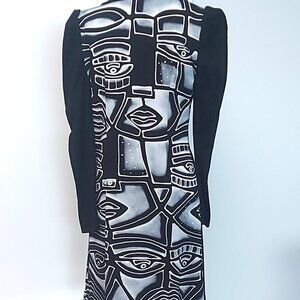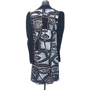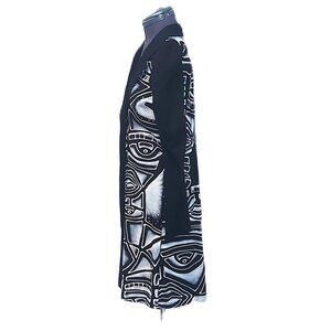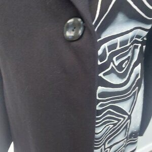 If you really want to make a statement and feel so comfortable while doing it, this coat belongs in your wardrobe. Designed by the Canadian company Rock 'N' Karma, this piece is handmade and offers the softness of rayon with lots of lycra to allow you to move while enjoying a body enhancing fit. The denseness of the rayon body keeps you warm and cozy but doesn't restrict your movement. Measurements are : PTP 18 inches (45.72 cm), waist 16 iches (40.64 cm), hip 20 inches (50.8 cm). sleeve 24 inches (60.96 cm). Size is marked medium but it could work for a small as well as the measures show. This is a gorgeous, piece by a Canadian designer, who could ask for more.