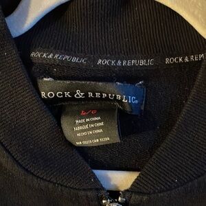Classic Rock & Republic black full-zip bomber-style jacket with front logo patch and bold “Rock & Republic” lettering down the sleeve. Features two front pockets and ribbed trim. Comfortable and versatile streetwear piece.