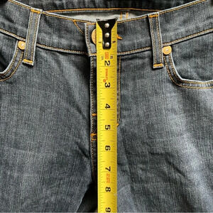 Like new condition. 5 pockets with zipper front closure. Both back pockets are embroidered with their Logo. The leg openings are in between a boot cut/ wide leg.