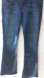 a pair of dark wash, bootcut or flared jeans with prominent red contrast stitching.
