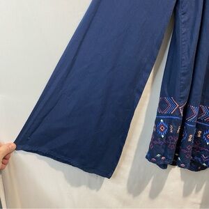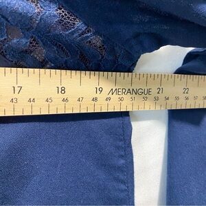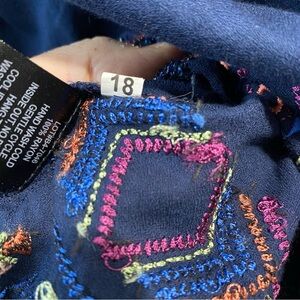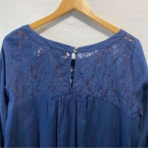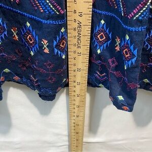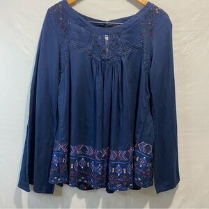 Chic deep blue top with colorful embroidery. Features lace accents and flowing sleeves. Ideal for versatile styling.