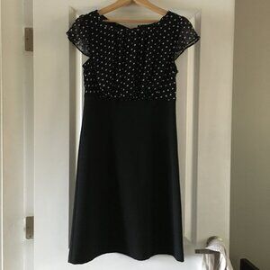 Very good preowned vintage condition black scuba bottom dress with black and white polka dot chiffon empire waist upper rockabilly, mobster, corporate midi dress by Lori Michaels. This is an awesome dress. It has loopholes for a belt, so you can accessorize it with something plain or outstanding. In excellent shape for its age. Made in Canada. A vintage gem.