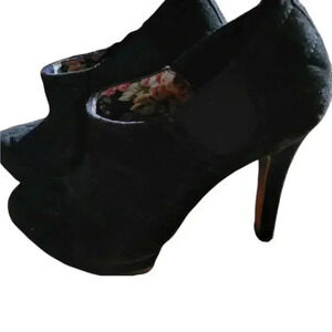 Great pair of Rocket Dog Suede Leather shoes in black size 8 with platform soles and 4" heels floral lining.stretch insert at side to allow foot to slide into shoe easily