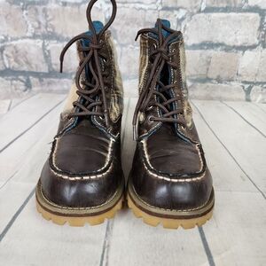 Rocket Dog Chunky Ankle Boot Lace Up Vegan Leather Plaid Fabric Size 6 1/2 Brown