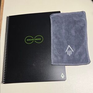 Black Rocketbook smart reusable notebook with a gray cleaning cloth. Eco-friendly and perfect for digital note-taking.