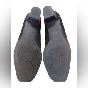 Black leather loafers featuring square toes and a low heel.