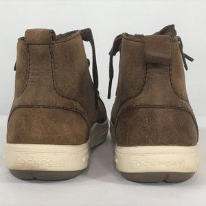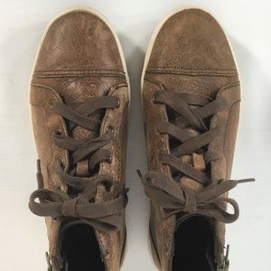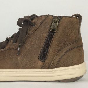High top runners have laces plus zip sides. Leather. Excellent used condition.