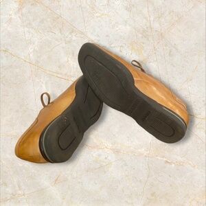 These tan leather Oxfords feature a smooth finish and a squared-off toe, offering a blend of classic style and modern appeal.