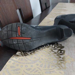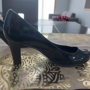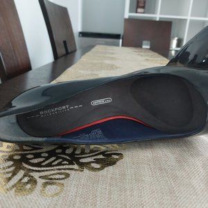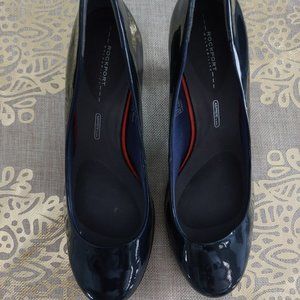Comfortable size 6.5 Rockport heels with solid shoe grips at the bottom. Soft padding inside. ~2 inches in height, perfect for conferences or business settings and easy transition to night on the town. Navy blue patent sheen