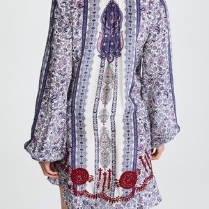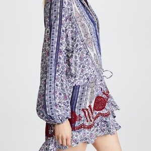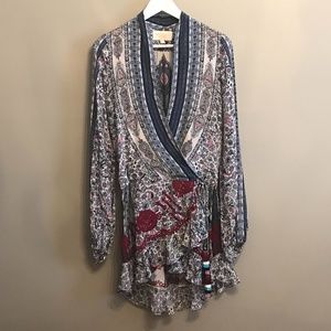 Cover-up dress, mini dress cut, faux-wrap silhouette with tie at front, flounce hem, long sleeves with covered elastic at cuffs. Partially lined. Lightweight, flow and breezy.
