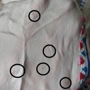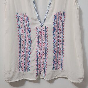 Top:Self: 100% silk. Lining: 100% viscose. Dry clean only. Whipstitch trim. V neck front. Sleeveless. Embroidered detail. There's some tiny pin prick holes on the top, see last photo.