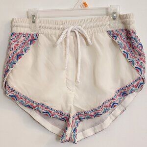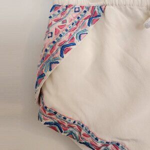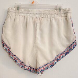 Shorts: Self: 100% silk. Lining: 100% viscose. Dry clean only. Elasticized drawstring waist. Embroidered trim. Shorts measure approx 9" in length.