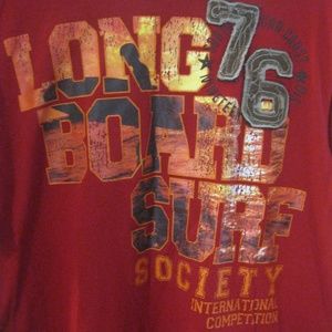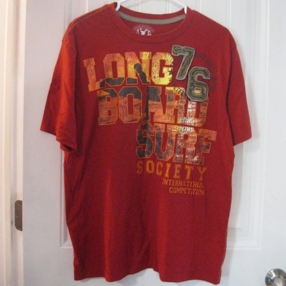 Men's red tee shirt, "Long board Surf Society International Competition".