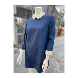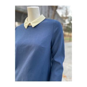 Navy blue self with contrast ivory collar & cuffs. Mini Length, rear zip closure with kitty cat pull charm. No stains, holes or tears. Pet and smoke free studio.
