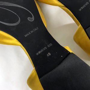 Golden yellow satin d'orsay style ballet flats with large crystal embellished buckle. I bought these on eBay and suspect they're not authentic Roger Vivier though they look it. I do not have a dust bag or box for these though they have been barely used as you can see in photos - just a couple of tiny scuffs at toes. Love this mustard gold colour! Price is firm.