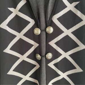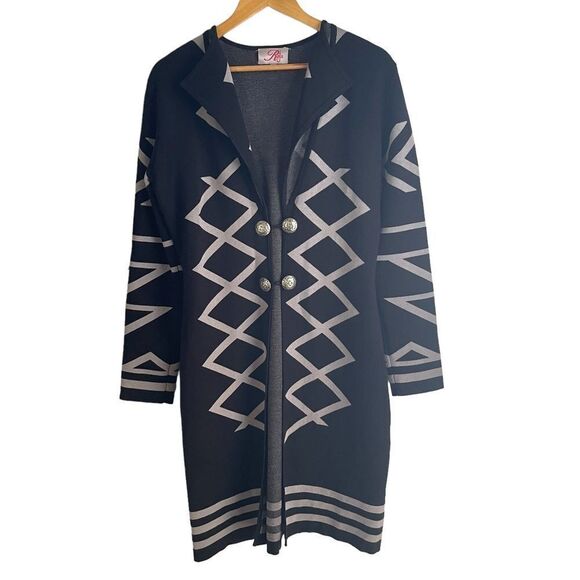 In very good condition. Roja black and grey southwestern / aztec patterned long duster. A gorgeous, heavy knit with a lapel collar and long sleeves. Silver embossed buttons on the front. Stripes near the bottom hem. Longer length and a beautiful layering piece for fall. Flat lay measurements: 18" pit to pit, 39" length.