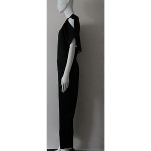 Side pant zip closure. Faux front pockets. Snap closure to close draped top. Satin crepe one piece jumpsuit.