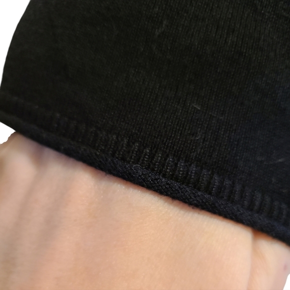 Closet staple black sweater with a round neckline and rolled hem & cuffs. Has a single pleat in the center on back, which gives it a slightly flared shape. Some decorative stitching on shoulders (blends in). There is no fabric tag, but it's a nice soft mid-weight sweater fabric. Good condition