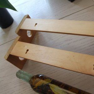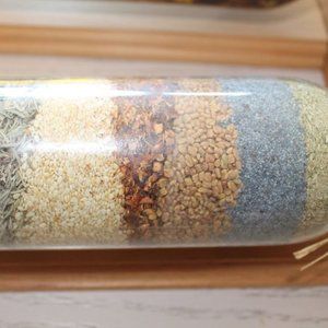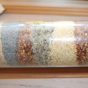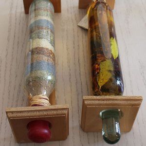 decorative oil and spice jars with wooden rack, 20 inches long, sealed, use as decoration or as rolling pin.
