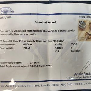 ROLORD New pair of 18kt yellow gold Martini design stud earrings 4-prong set with two round brilliant cut 1ct moissanite, Warranty 3 months, appraisal is 3000$, come with the appraisal and warranty card, Available in White gold and Yellow gold..