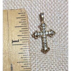 This elegant cross pendant features a gold-tone finish adorned with sparkling clear rhinestones. It offers a timeless design suitable for various styles.