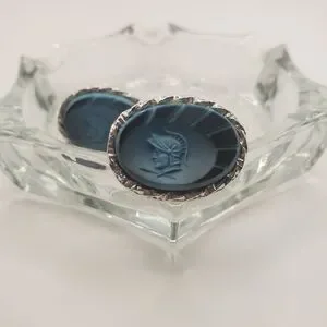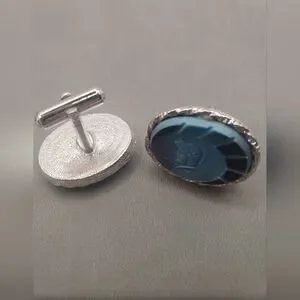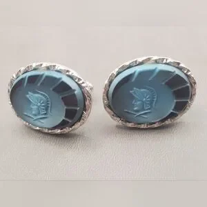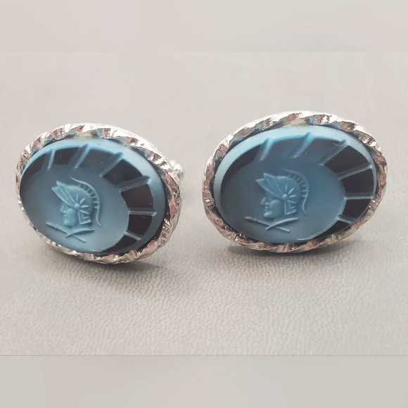 Oval Roman Soldier silvertone cufflinks with unidentified carved blue stone(?)