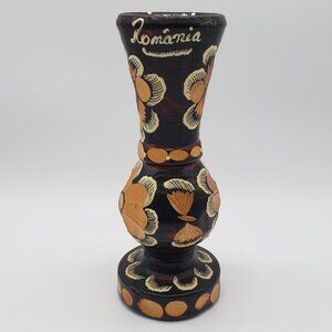 Romanian 2007 Hand Turned Hand Painted Floral Wooden Pedestal Vase - 8.75"