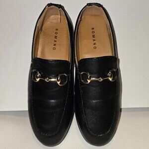 Only worn once at the wedding! Smart and elegant, these black loafers for boys by Romano are made from smooth faux leather. Lined in soft faux leather with a slim non-slip rubber outsole, these slip-on shoes have a gold horsebit detail across the toes, for a classic look.
