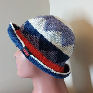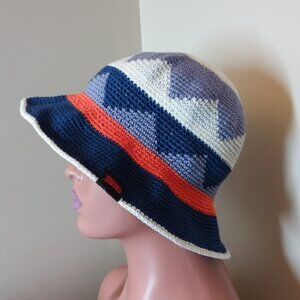 With its multicolored geometric pattern, it features accents of crochet and a wide brim, this hat is both lightweight and breathable, making it ideal for summer and spring. The hat is one size fits all, making it a versatile accessory for any occasion, whether it's a party, cocktail event, or a day at the beach.